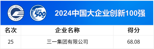 “2024中國大企業(yè)創(chuàng)新100強(qiáng)”依據(jù)對2023年企業(yè)研發(fā)投入強(qiáng)度、研發(fā)費(fèi)用、發(fā)明專利數(shù)、非發(fā)明專利數(shù)、收入利潤率等作為評價指標(biāo)計算綜合得分排序產(chǎn)生。三一集團(tuán)始終將研發(fā)創(chuàng)新視為事業(yè)發(fā)展的第一推動力,研發(fā)投入大、創(chuàng)新成果豐碩,在榜單中位列第25名。