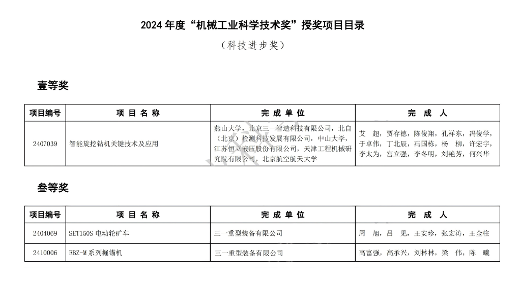 北京三一智造科技有限公司“智能旋挖鉆機關(guān)鍵技術(shù)及應用”項目榮獲科技進步獎一等獎;三一重型裝備有限公司“SET150S電動輪礦車”項目、“EBZ-M系列掘錨機”項目榮獲科技進步獎三等獎。